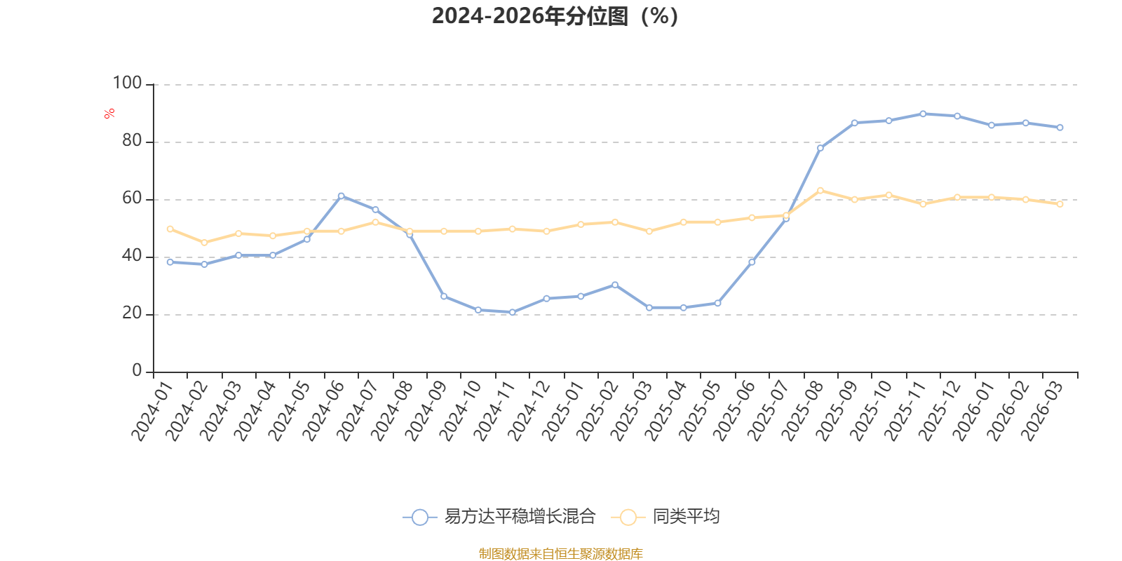 通过所选区间该基金净值增长率分位图,可以观察该基金与同类基金业绩比较情况。图为坐标原点到区间内某时点的净值增长率在同类基金中的分位数。