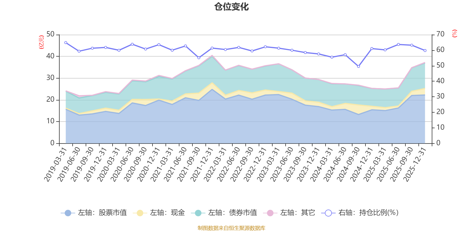 据定期报告数据统计,近三年平均股票仓位为58.95%,同类平均为67.52%。2019年一季度末基金达到64.87%的最高仓位,2024年三季度末最低,为49.54%。