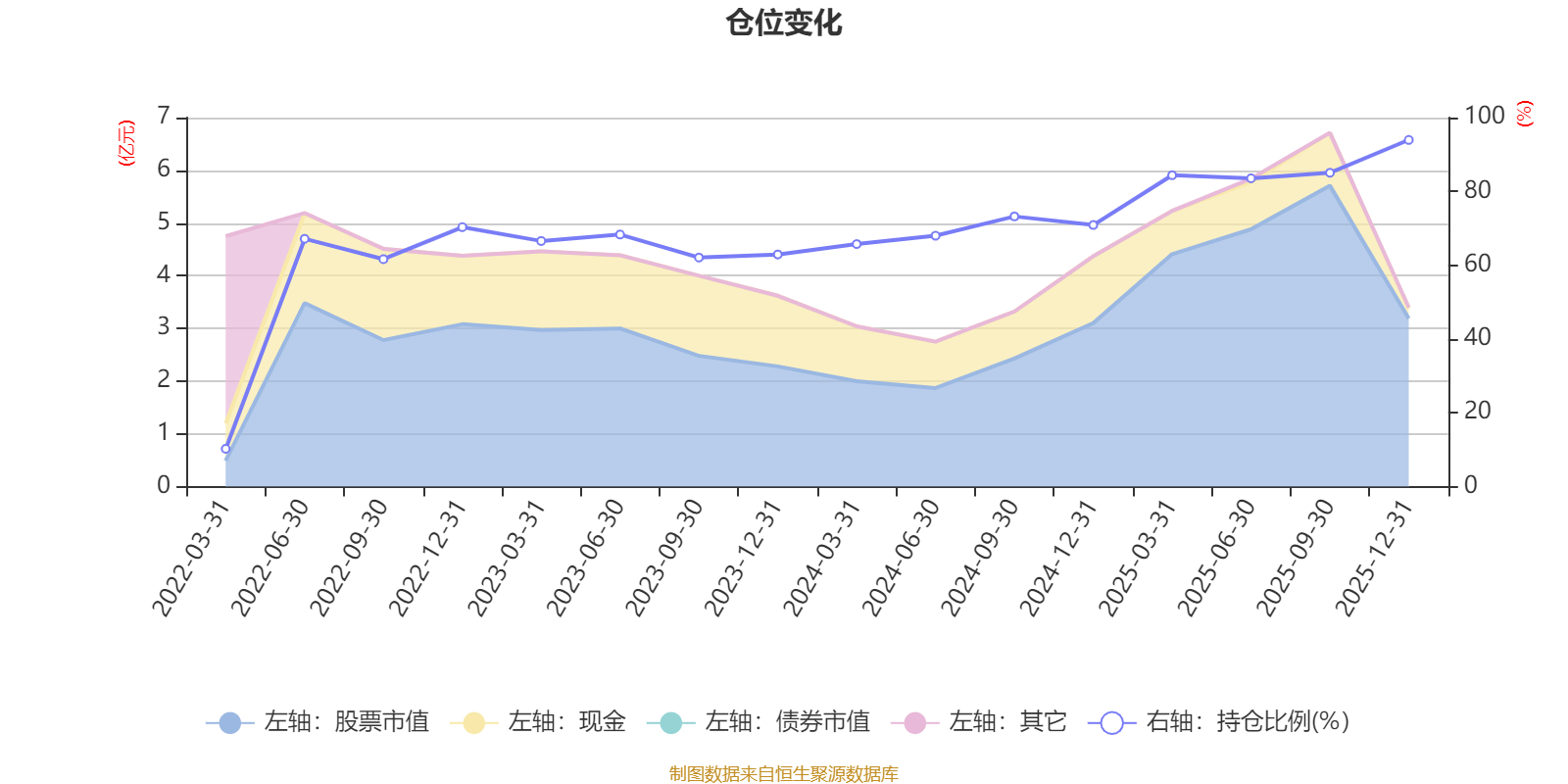 据定期报告数据统计,近三年平均股票仓位为73.71%,同类平均为85.83%。2025年末基金达到93.95%的最高仓位,2022年一季度末最低,为10.23%。