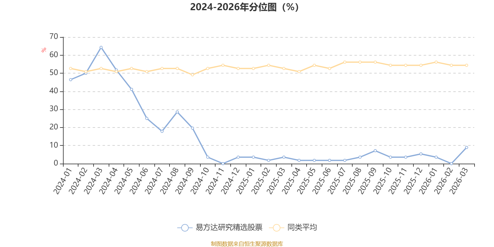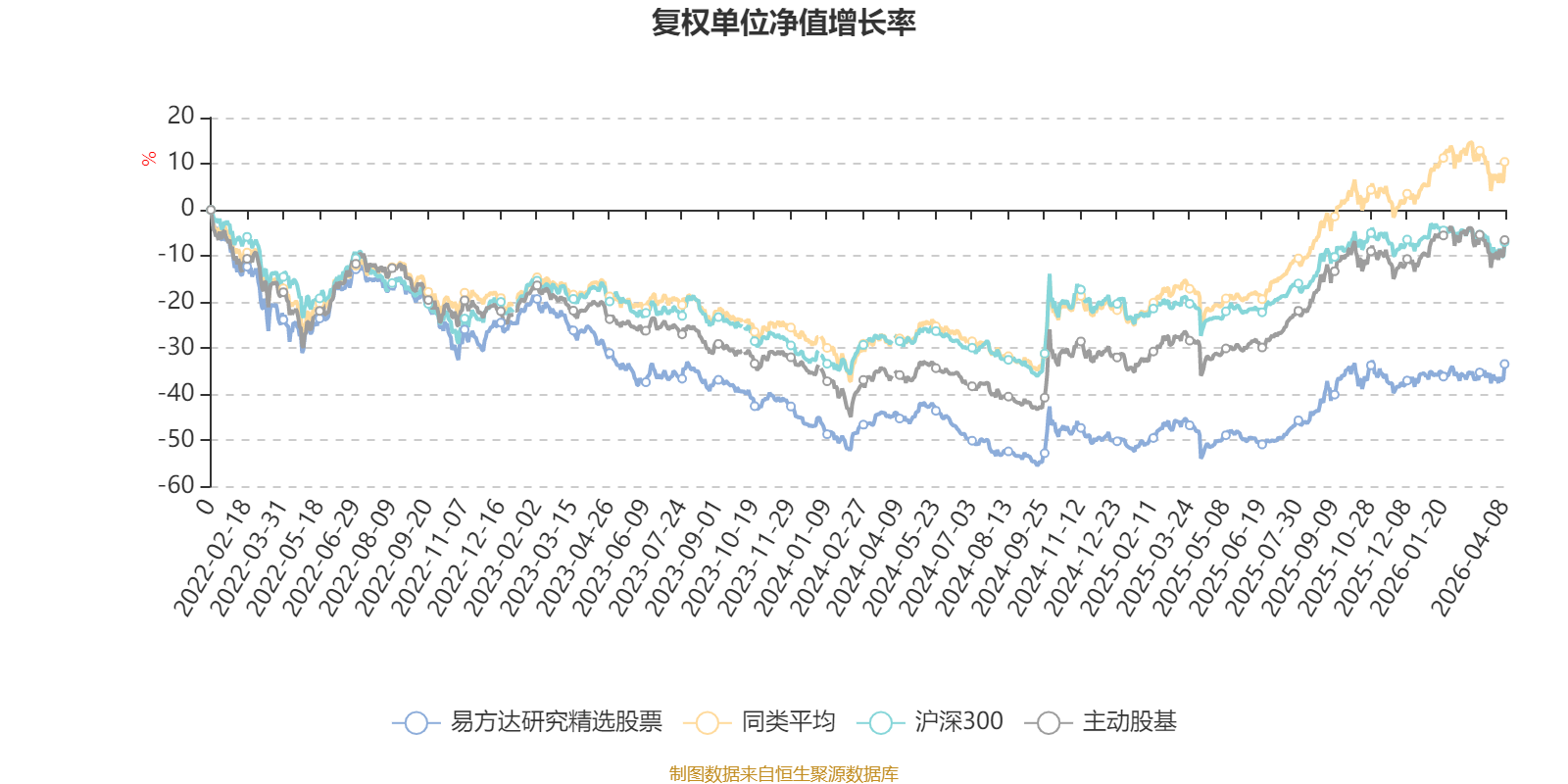 截至4月8日,易方达研究精选股票近三个月复权单位净值增长率为3.95%,位于同类可比基金15/58;近半年复权单位净值增长率为0.83%,位于同类可比基金32/58;近一年复权单位净值增长率为42.99%,位于同类可比基金29/57;近三年复权单位净值增长率为-9.47%,位于同类可比基金53/57。