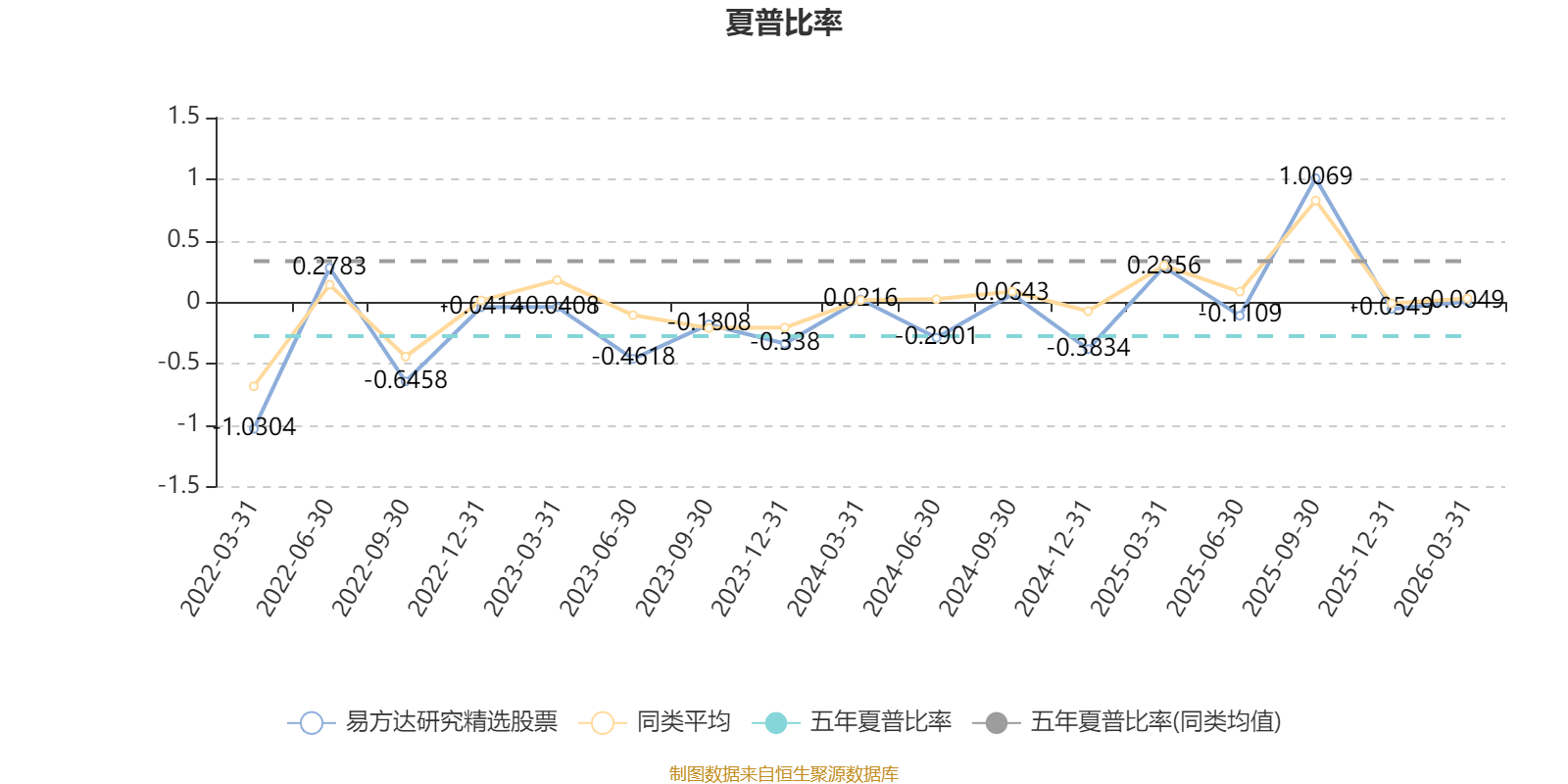 截至3月31日,基金近三年夏普比率为0.0459,位于同类可比基金57/57。