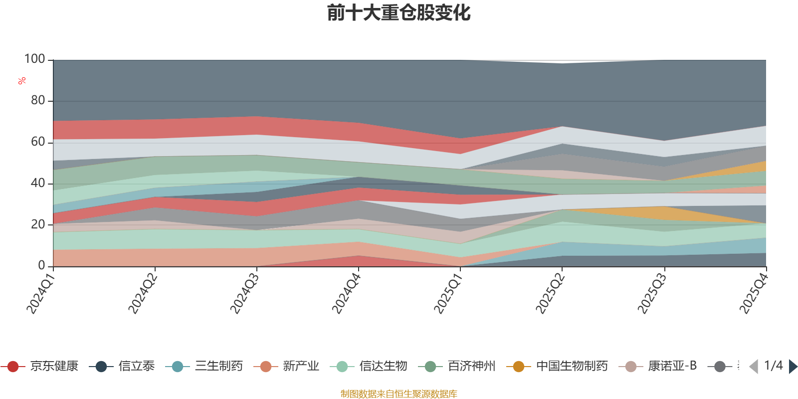该基金持股集中度较高,近2年前十大重仓股集中度长期超过60%。截至2025年末,基金十大重仓股分别是恒瑞医药、映恩生物-B、三生制药、热景生物、翰森制药、信达生物、信立泰、科伦博泰生物-B、迈威生物、药明生物。