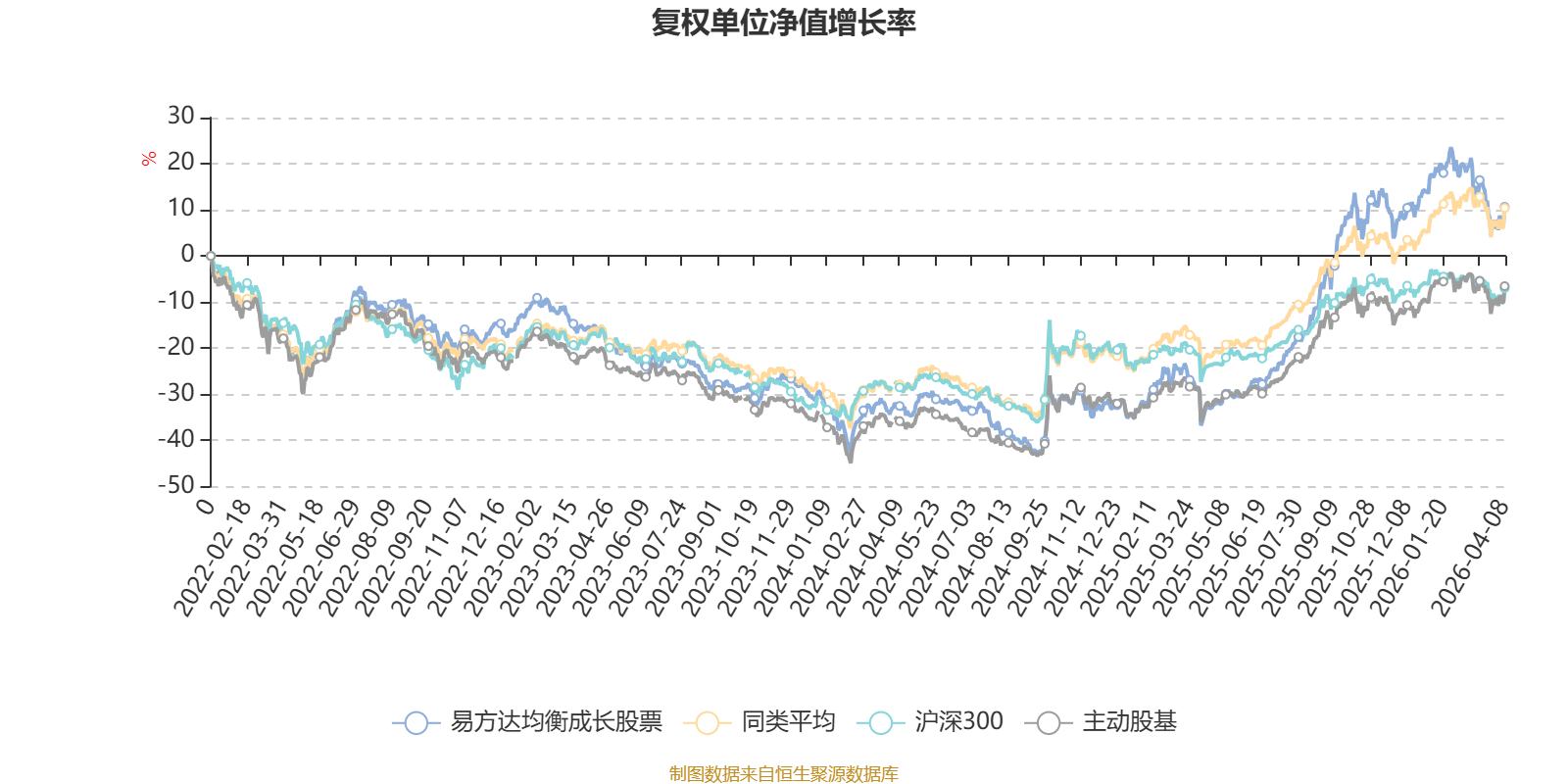 截至4月8日,易方达均衡成长股票近三个月复权单位净值增长率为-5.47%,位于同类可比基金54/58;近半年复权单位净值增长率为-0.55%,位于同类可比基金40/58;近一年复权单位净值增长率为73.13%,位于同类可比基金11/57;近三年复权单位净值增长率为30.48%,位于同类可比基金28/57。