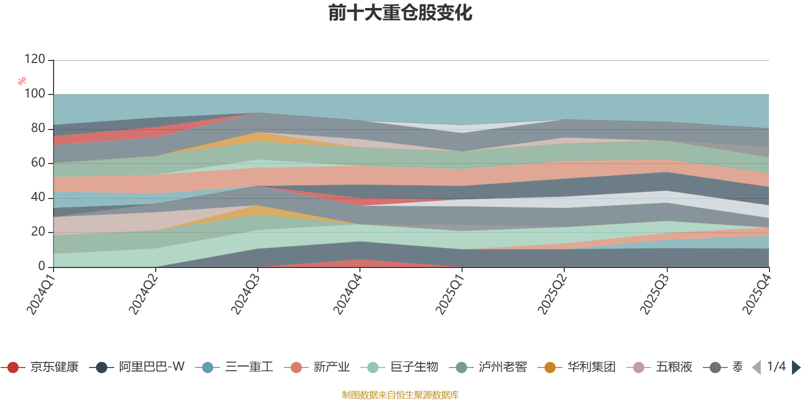 该基金持股集中度较高,近2年前十大重仓股集中度长期超过60%。截至2025年末,基金十大重仓股分别是贵州茅台、阿里巴巴-W、山西汾酒、腾讯控股、中国海洋石油、海大集团、三一重工、安琪酵母、分众传媒、新产业。