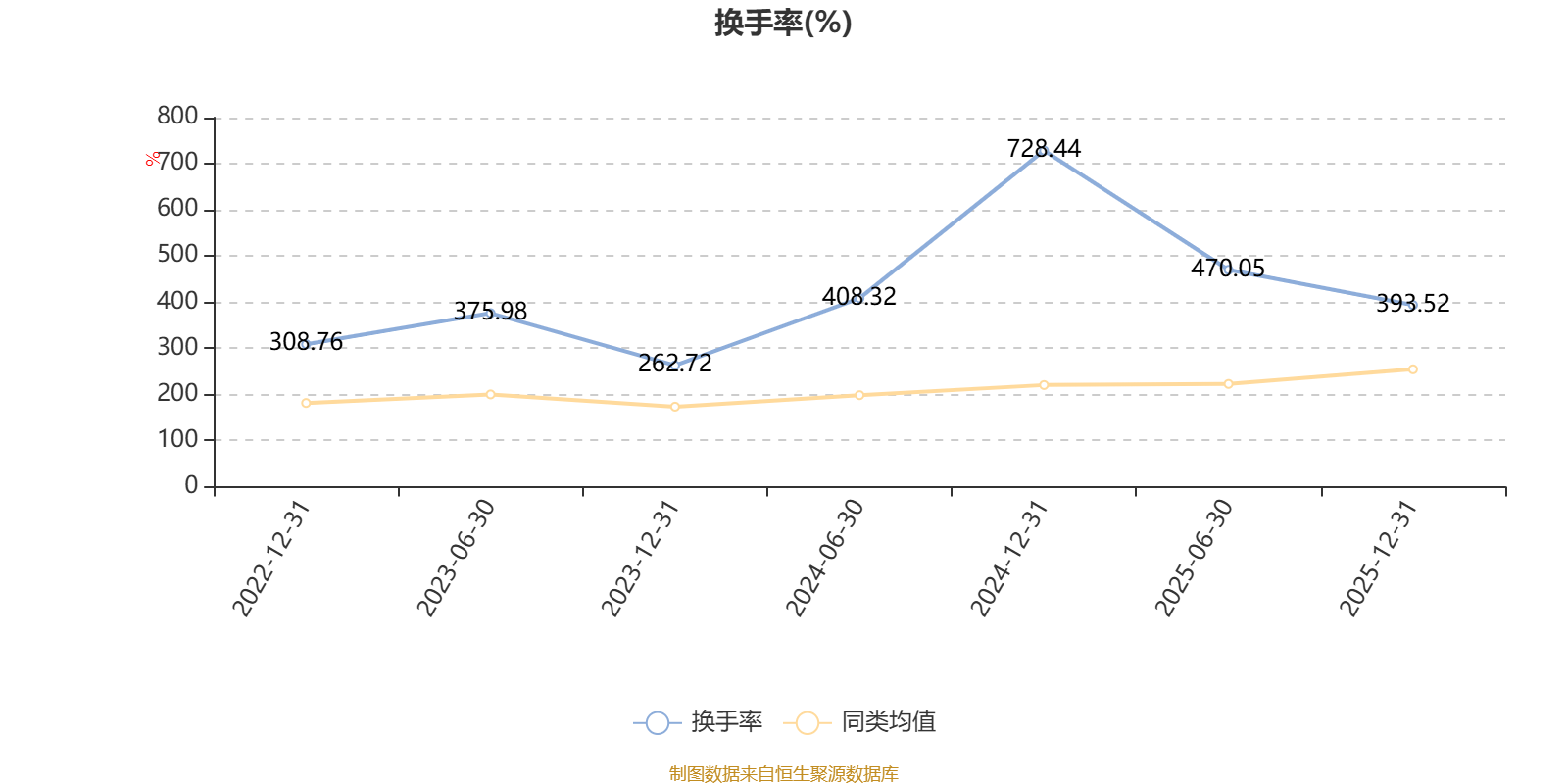 截至2025年12月31日,基金最近一年换手率约876.87%,持续高于同类均值。