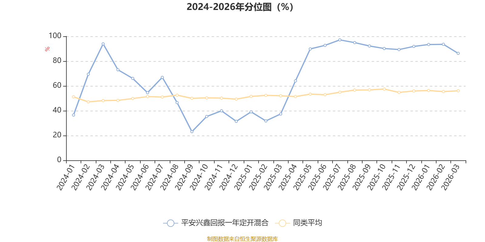 通过所选区间该基金净值增长率分位图,可以观察该基金与同类基金业绩比较情况。图为坐标原点到区间内某时点的净值增长率在同类基金中的分位数。