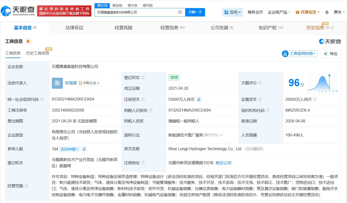 隆基绿能旗下无锡氢能科技公司增资至5.5亿元