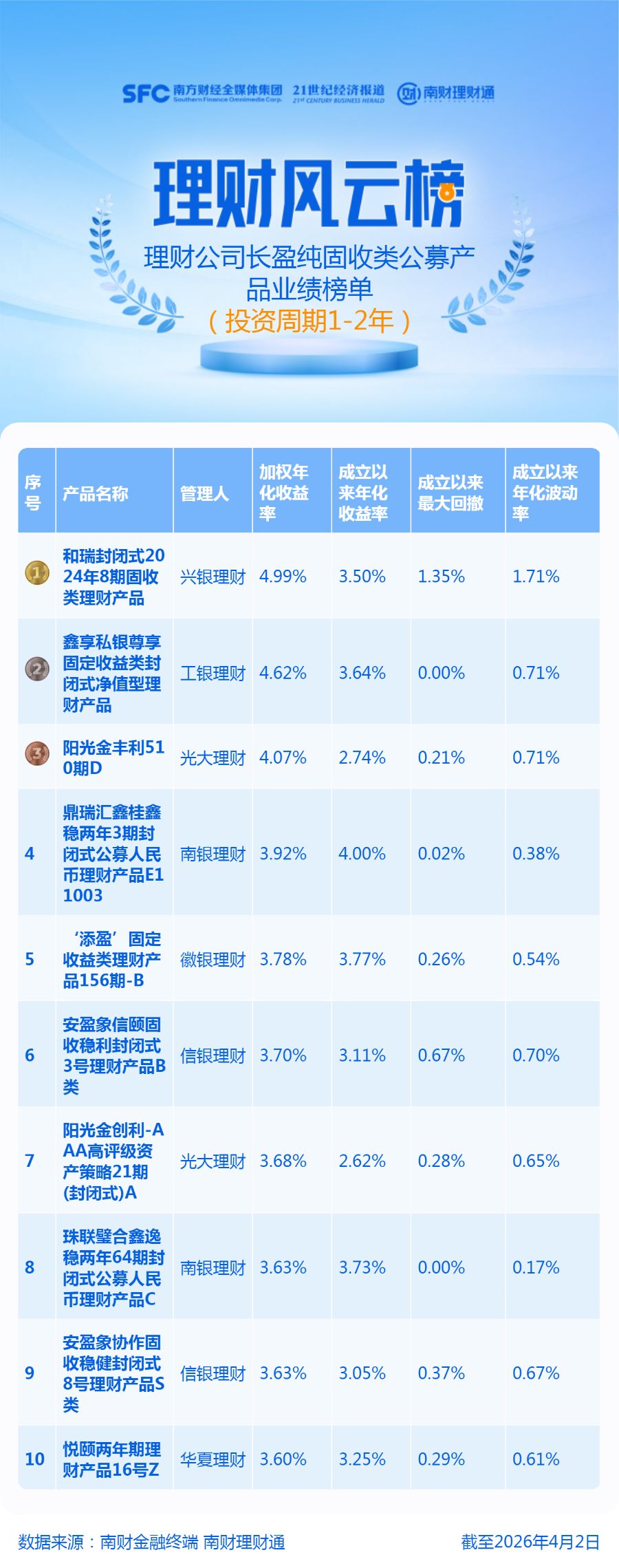 本期榜单统计对象为理财公司发行的成立满1年的公募纯固收产品,投资周期为1—2年(含)期限,同系列同投资周期产品保留一只,加权年化收益率计算方式为“5%*近1月年化收益率+10%*近3月年化收益率+15%*近6月年化收益率+30%*近1年年化收益率+40%*成立以来年化收益率”,排名依据为加权年化收益率,数据计算截止时间为2026年4月2日。