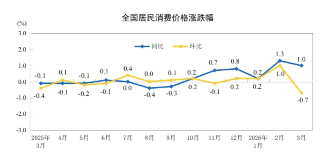 国家统计局4月10日发布数据显示,3月份,春节长假后消费需求季节性回落,居民消费价格指数(CPI)环比下降0.7%,同比上涨1.0%,扣除食品和能源价格的核心CPI同比上涨1.1%。