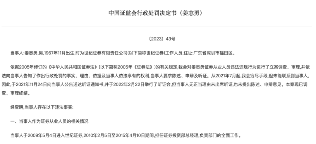 近日,证监会披露了关于世纪证券原证券投资部总经理姜某勇的行政处罚决定书及市场禁入决定书。
