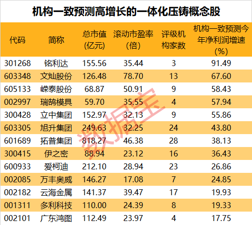 鉴于一体化压铸市场前景,不少概念股获得多家券商研报关注。数据宝统计,共13只概念股获3家以上券商给予“积极型”评级。
