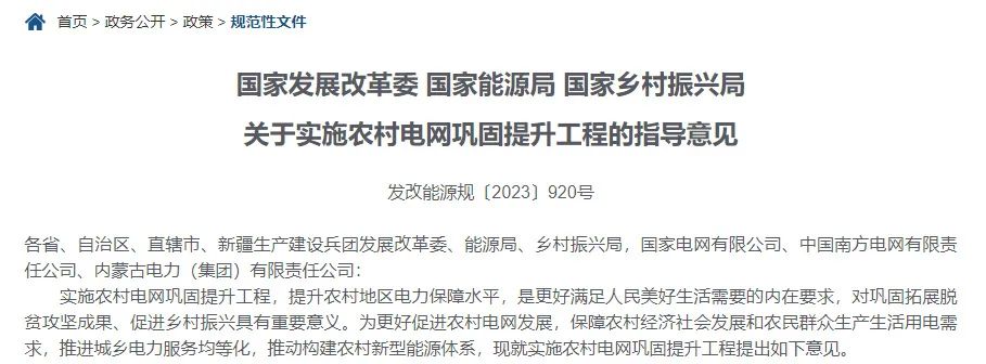 7月14日,国家发展改革委、国家能源局、国家乡村振兴局发布《关于实施农村电网巩固提升工程的指导意见》(以下简称《指导意见》),提出到2035年,基本建成安全可靠、智能开放的现代化农村电网。农村地区电力供应保障能力全面提升,城乡电力服务基本实现均等化,全面承载分布式可再生能源开发利用和就地消纳,农村地区电气化水平显著提升,电力自主保障能力大幅提高,有力支撑乡村振兴和农业农村现代化。
