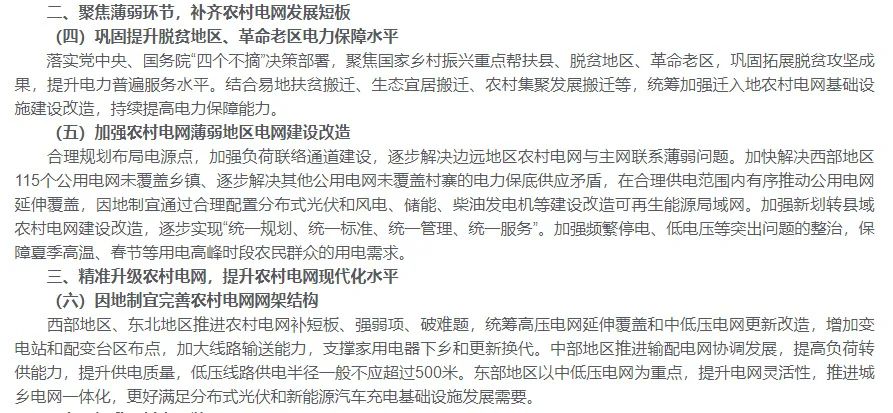 在补齐农村电网发展短板方面,一是巩固提升脱贫地区、革命老区电力保障水平,二是加强农村电网薄弱地区电网建设改造。
