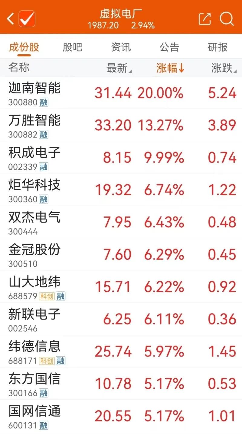 虚拟电厂板块是今日盘面无数不多的热点之一。截至收盘,东财发布的虚拟电厂概念指数大涨2.94%,迦南智能收获20%幅度涨停,积成电子同样涨停,万胜智能涨超13%。
