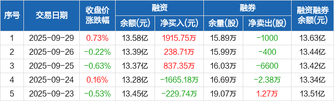 融资方面,当日融资买入6376.94万元,融资偿还4461.2万元,融资净买入1915.75万元,连续3日净买入累计2991.8万元。融券方面,融券卖出2000股,融券偿还3000股,融券余量15.89万股,融券余额506.73万元。融资融券余额合计13.63亿元。