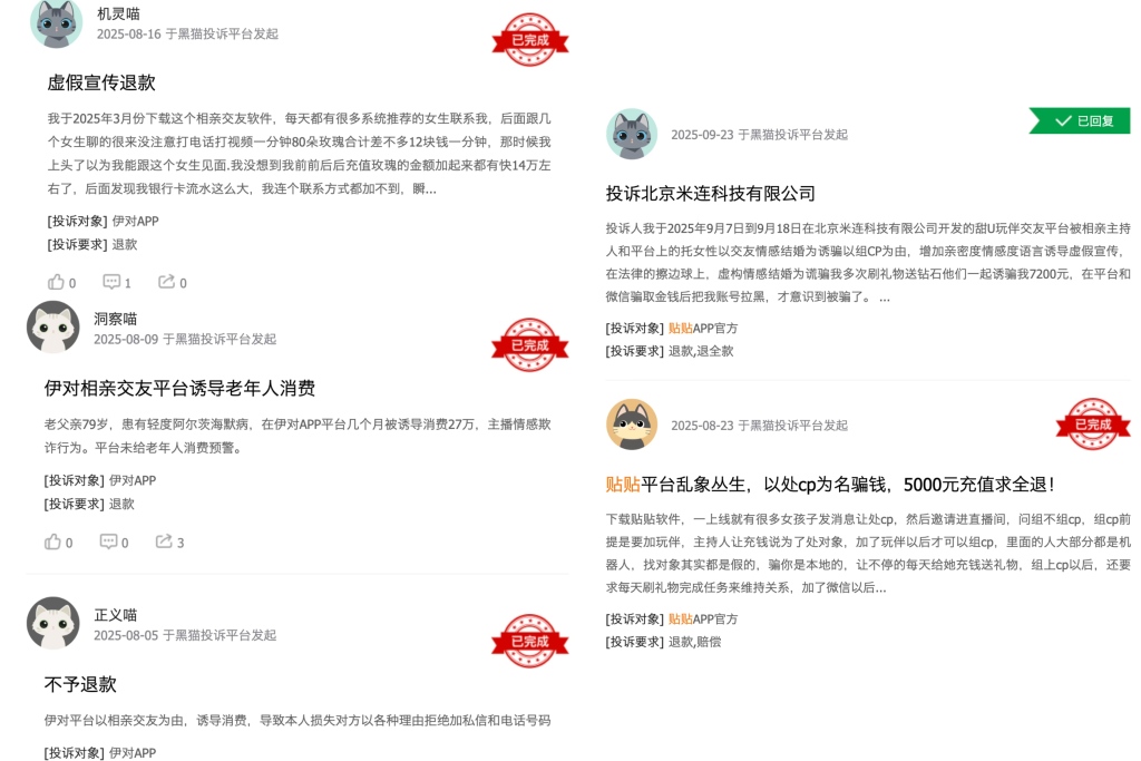 而米连科技旗下另一款APP“贴贴”也存在类似的纠纷。黑猫投诉平台上,存在多起关于“以组CP、建立关系等名义诱导消费”的投诉。
