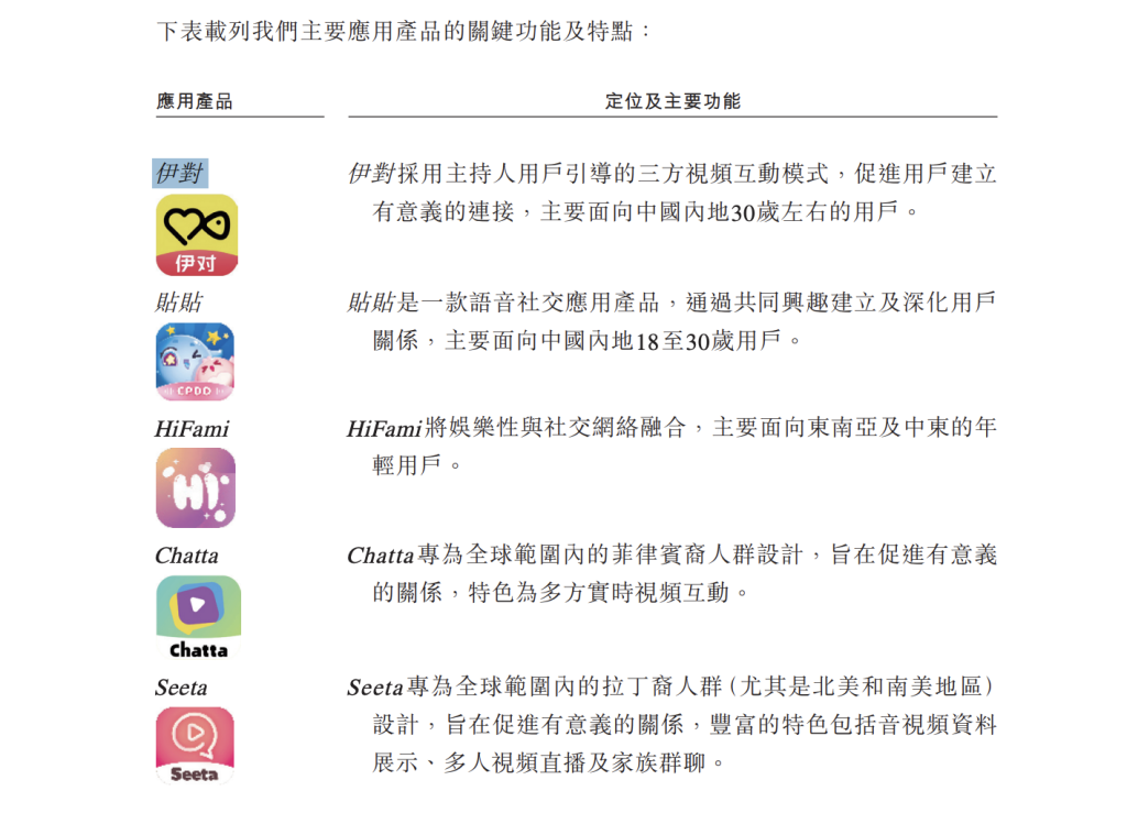 招股书显示,在线情感社交平台公司米连科技成立于2015年,其应用产品涵盖国内外市场,国内包含“伊对”及“贴贴”等主要应用,海外应用产品主要有“HiFami”、“Chatta及Seeta”等。