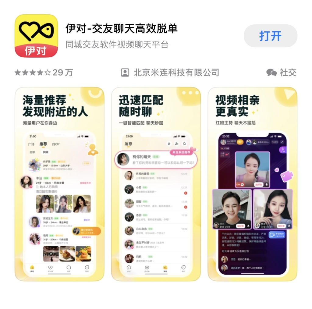 其中,2017年推出的音视频恋爱社交APP“伊对”,凭借主持人引导的三方视频互动模式,成为该公司绝对支柱。