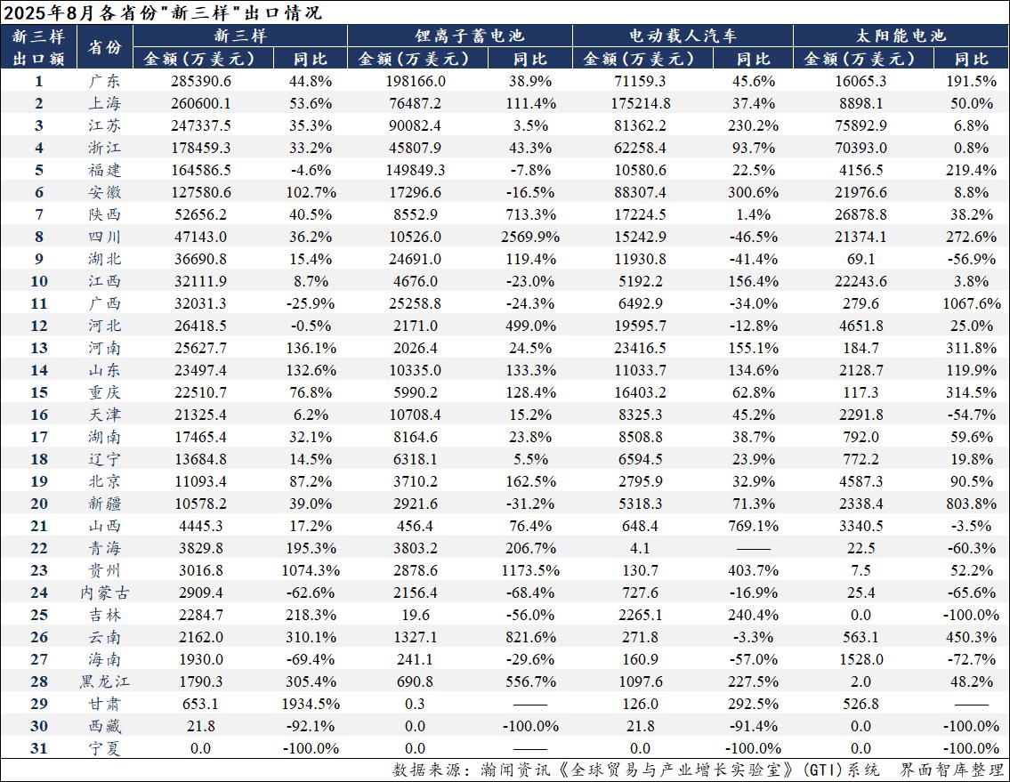 1-8月,全国“新三样”出口规模前十大省份依次为广东、江苏、上海、福建、浙江、安徽、陕西、四川、广西、河北。除河北累计同比下降、上海累计同比增长1.5%之外,其余前十省份累计同比增速都在10%以上,其中,四川累计同比增速最高,达到68.1%,安徽次之,达到64.7%、广西则为54.2%、广东为34.0%、陕西为32.8%。