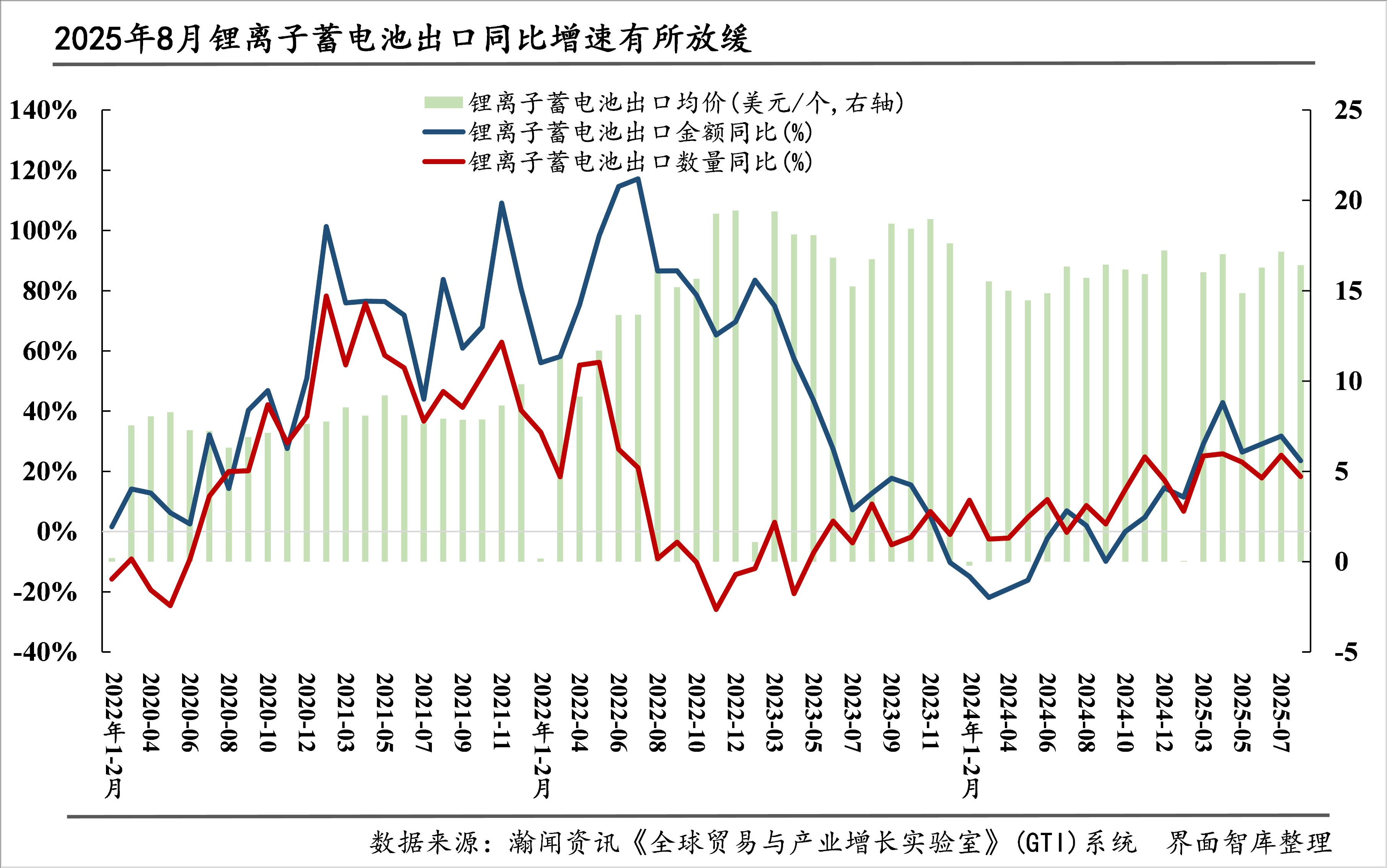 据界面智库和瀚闻资讯统计,2025年1-8月,我国“新三样”进出口总额1120.3亿美元,同比增长13.8%。其中,出口1078.0亿美元,同比增长16.3%;进口42.4亿美元,同比下降27.2%。8月当月,我国“新三样”进出口总额173.1亿美元,同比增长30.5%,环比增长9.8%。其中,出口166.0亿美元,同比增速加快6.8个百分点至34.3%,环比增速加快0.6个百分点至9.6%;进口7.1亿美元,同比下降21.8%,环比增长14.3%。