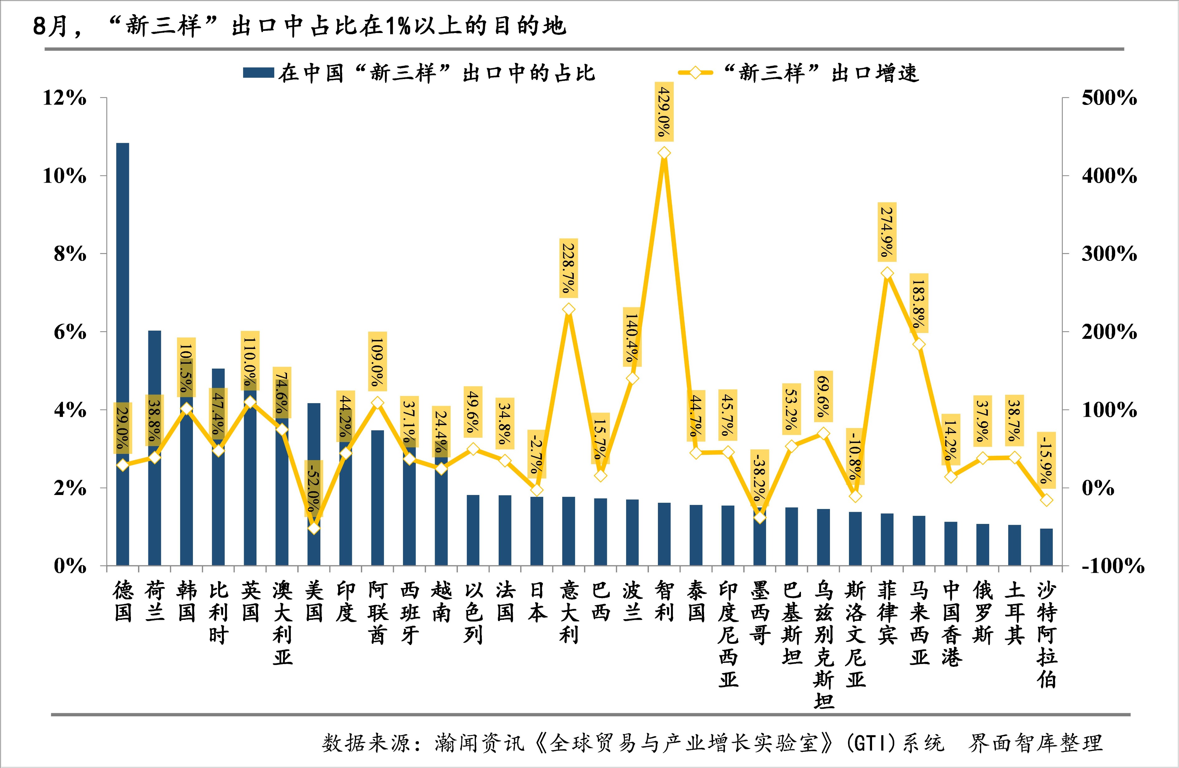 三、韩国对8月“新三样”出口贡献最大,英国和德国次之
