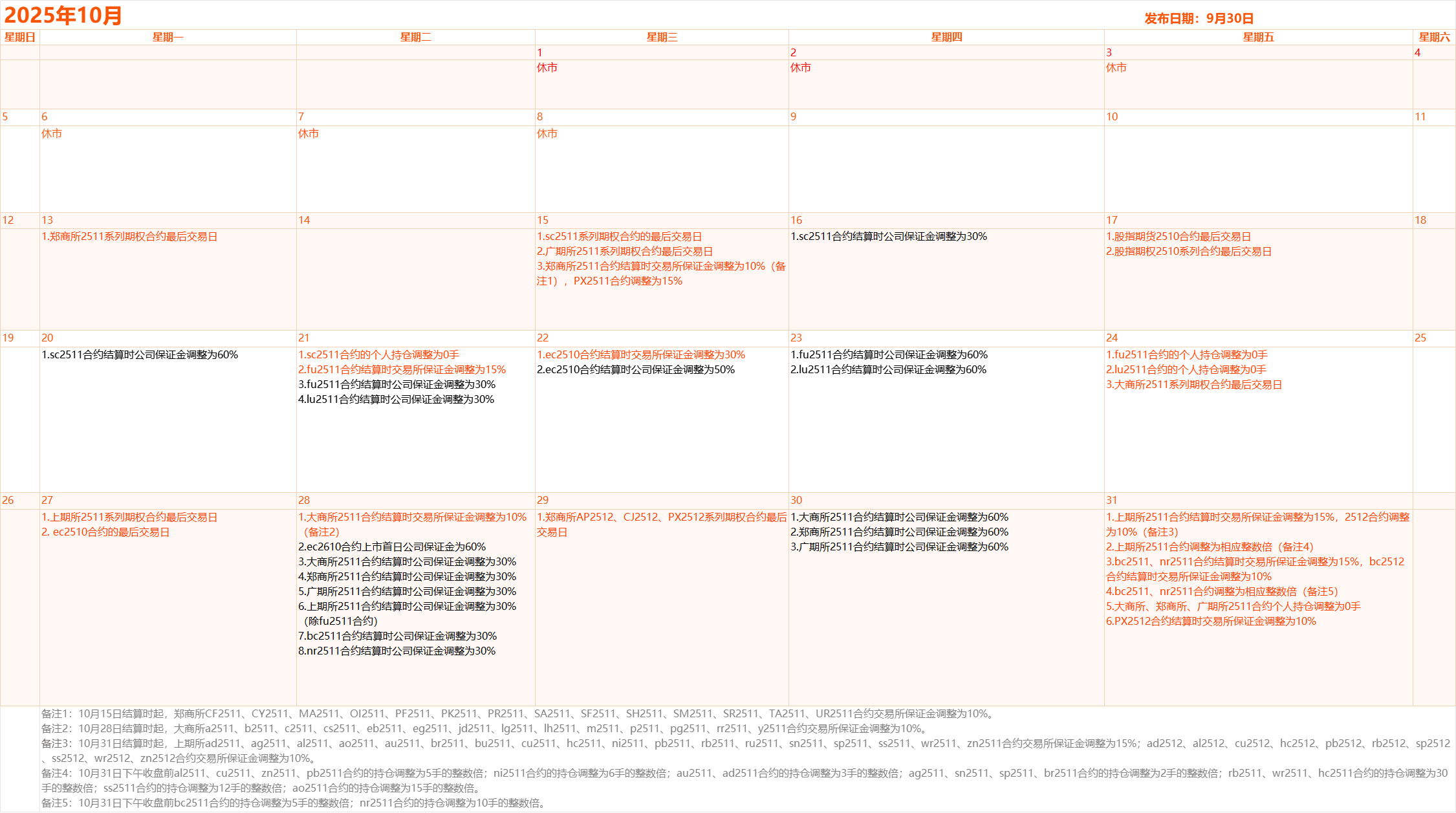 10月交易日历