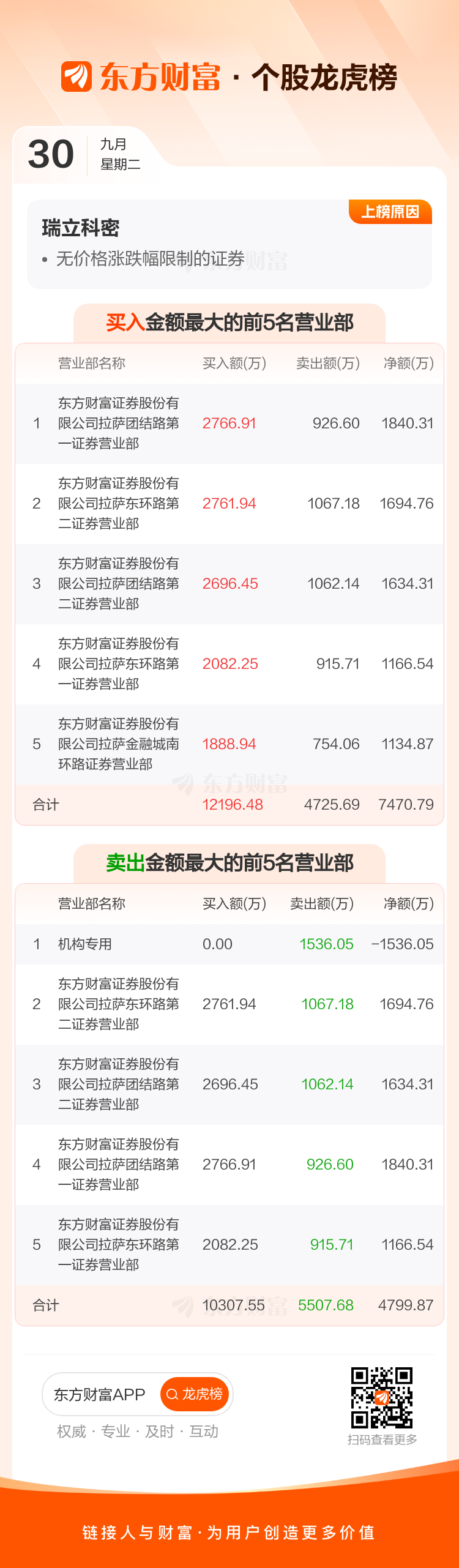 交易所2025年9月30日公布的交易公开信息显示,瑞立科密因成为无价格涨跌幅限制的证券上榜。瑞立科密当日收报63.39元,涨跌幅49.93%,换手率67.41%,成交额18.88亿。