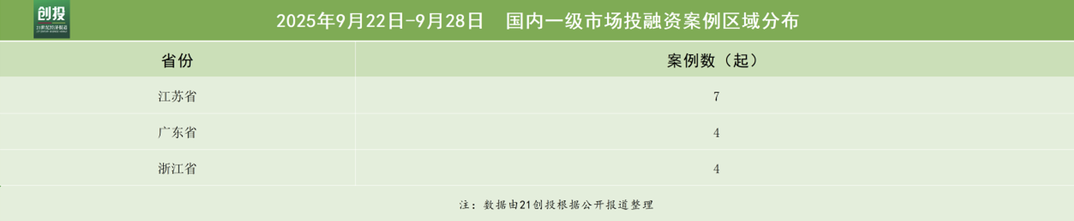 21创投不完全统计,9月22日—9月28日,报告日期内国内一级市场发生融资事件22起。其中,有19笔融资披露了融资金额和币种信息,总规模约合人民币33.66亿元人民币。