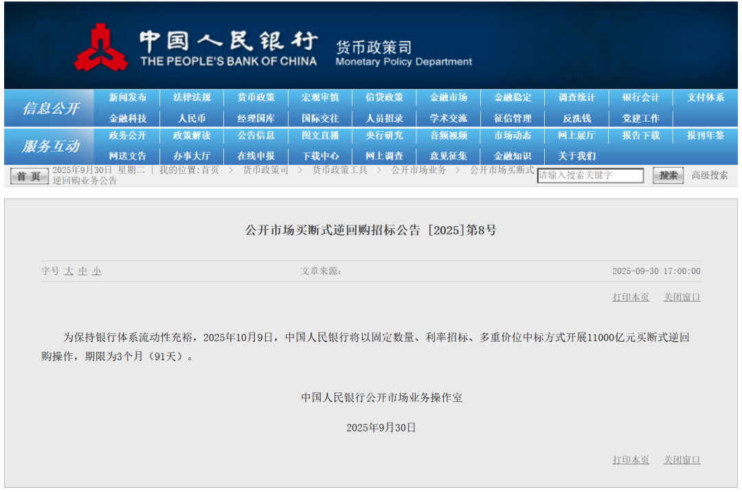 9月30日,央行发布公告,为保持银行体系流动性充裕,2025年10月9日,中国人民银行将以固定数量、利率招标、多重价位中标方式开展11000亿元买断式逆回购操作,期限为3个月(91天)。