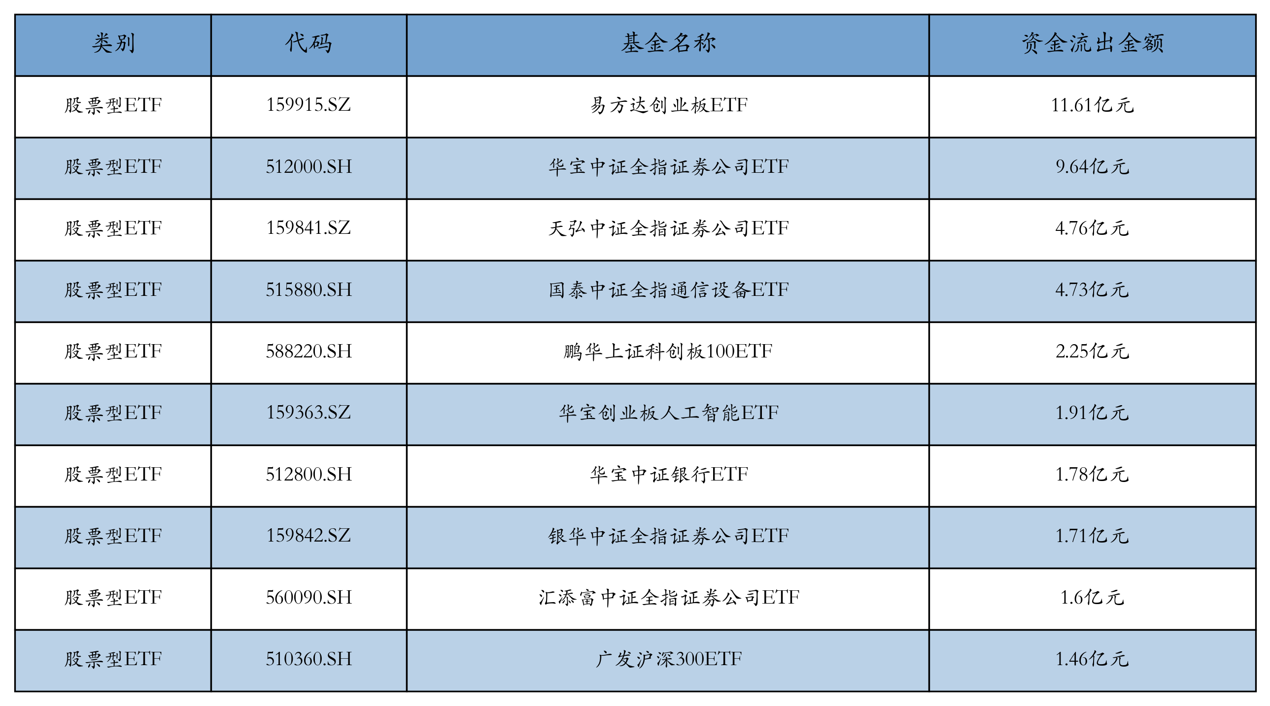 昨日股票型ETF资金流出最多的3只ETF及其流出金额分别为:易方达创业板ETF(流出11.61亿元)、华宝中证全指证券公司ETF(流出9.64亿元)、天弘中证全指证券公司ETF(流出4.76亿元)。资金流出前10详情见下表: