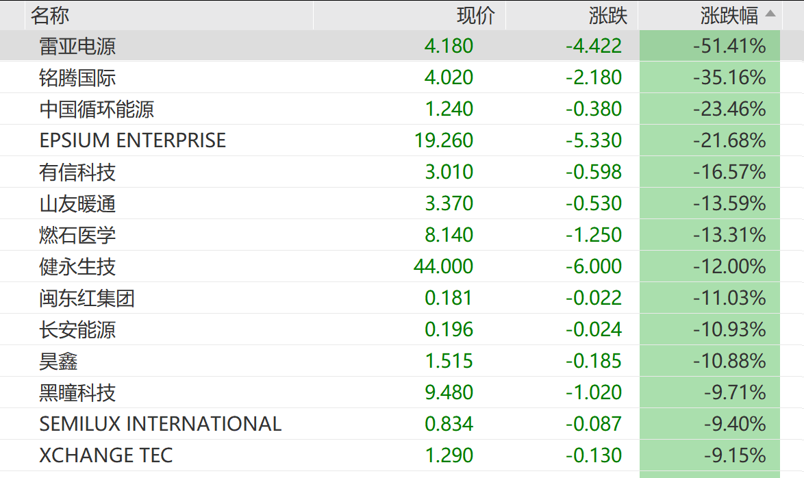 截至23:48,雷亚电源、铭腾国际等多只中概股跌幅超10%。