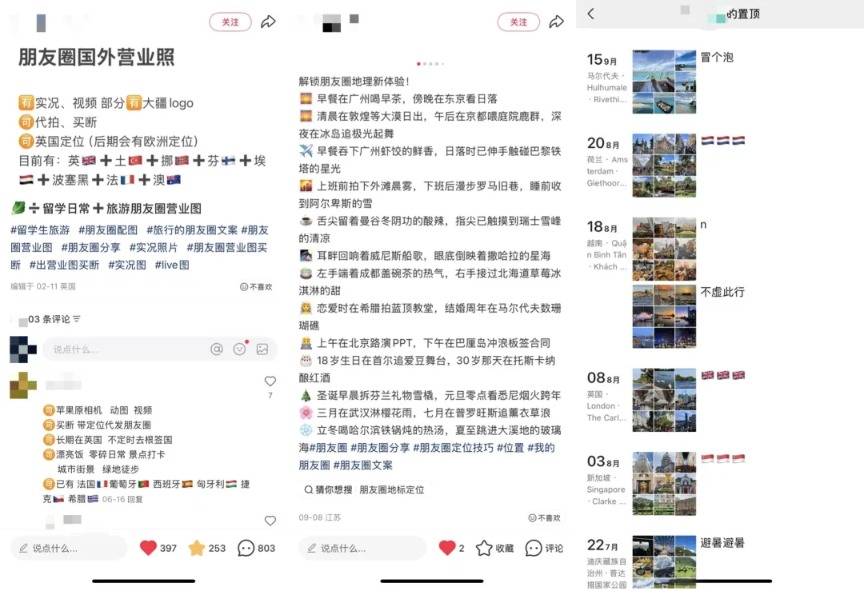 当社交平台的动态支持显示IP定位后,一门新的隐秘生意诞生了。用有些卖家的话来说,这是一种“超高性价比出国旅游”——定位当地发布相关照片视频,就相当于去了那儿。