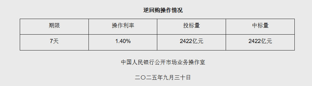 中新网9月30日电据央行网站消息,2025年9月30日中国人民银行以固定利率、数量招标方式开展了2422亿元7天期逆回购操作。具体情况如下: