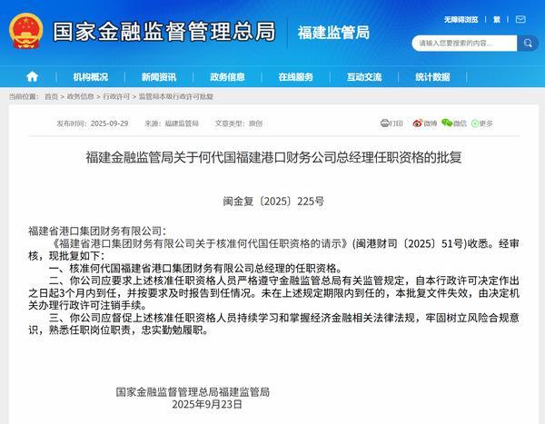 中国网财经9月30日讯昨日,福建金融监管局公布相关批复,核准何代国福建省港口集团财务有限公司(简称“福建港口财务公司”)总经理的任职资格。以下是相关批复正文: