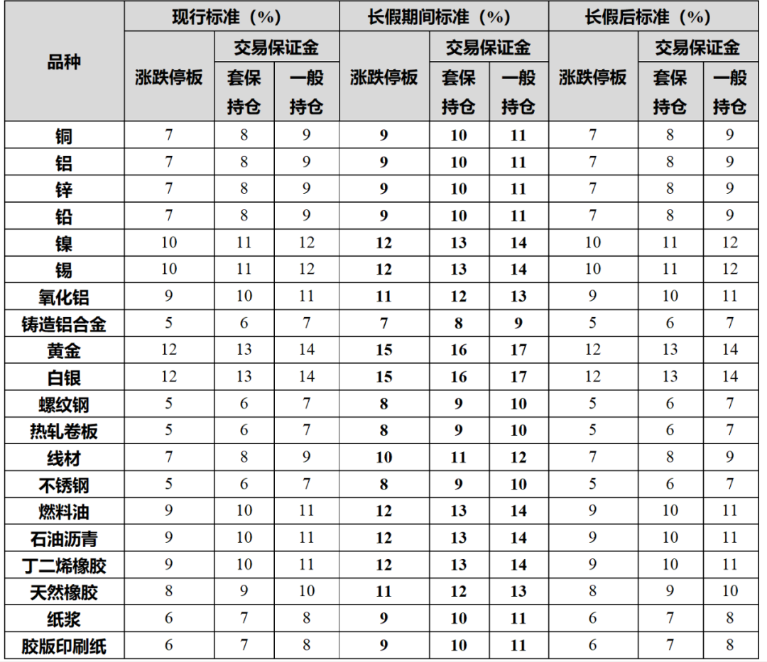 上海期货交易所国庆节、中秋节期间相关品种涨跌停板幅度和交易保证金比例调整一览表