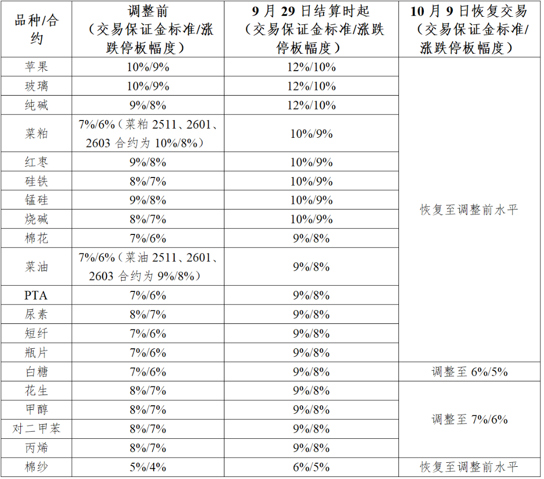 郑州商品交易所国庆节、中秋节期间相关品种涨跌停板幅度和交易保证金比例调整一览表
