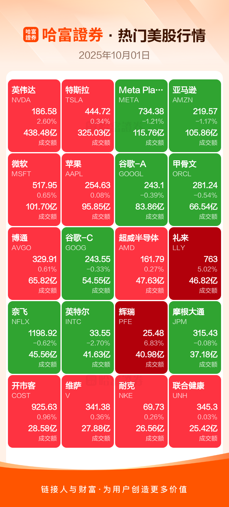 英伟达涨2.60%,特斯拉涨0.34%,Meta Platforms Inc-A跌1.21%,亚马逊跌1.17%,微软涨0.65%,苹果涨0.08%,谷歌-A跌0.39%,甲骨文跌0.54%,博通涨0.61%,谷歌-C跌0.33%。