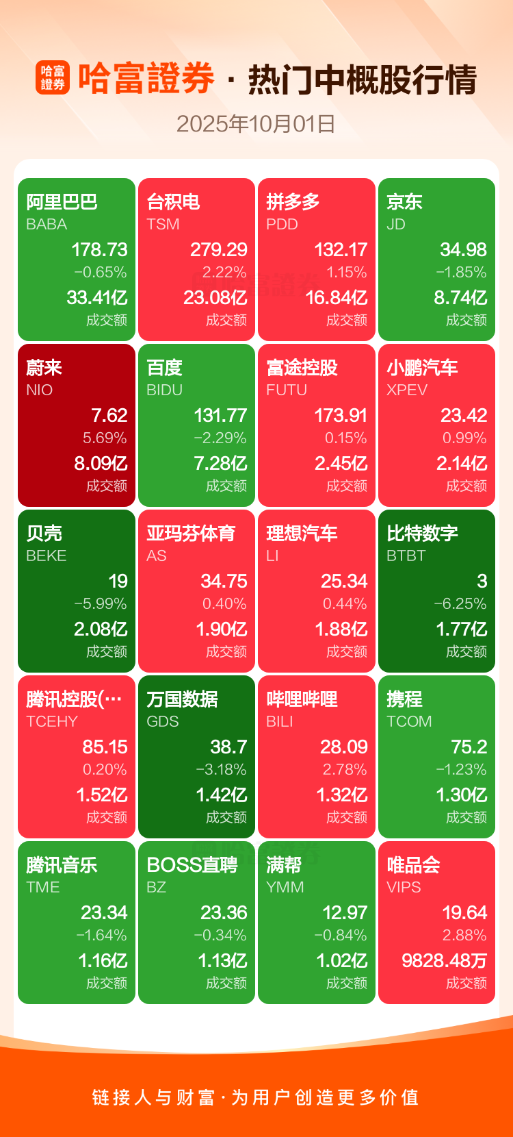 阿里巴巴跌0.65%,台积电涨2.22%,拼多多涨1.15%,京东跌1.85%,蔚来涨5.69%,百度跌2.29%,富途控股涨0.15%,小鹏汽车涨0.99%,贝壳跌5.99%,亚玛芬体育涨0.40%。