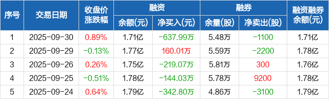 融资方面,当日融资买入279.85万元,融资偿还917.84万元,融资净偿还637.99万元。融券方面,融券卖出0股,融券偿还1100股,融券余量5.48万股,融券余额43.4万元。融资融券余额合计1.71亿元。
