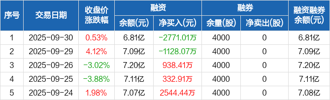 融资方面,当日融资买入8208.33万元,融资偿还1.1亿元,融资净偿还2771.01万元。融券方面,融券卖出0股,融券偿还0股,融券余量4000股,融券余额28.89万元。融资融券余额合计6.81亿元。