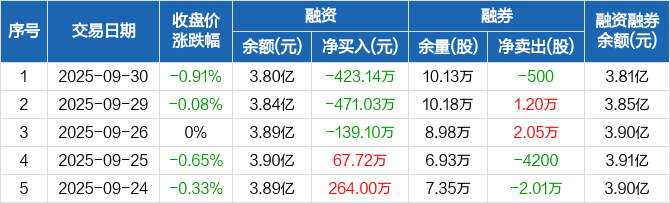 融资方面,当日融资买入1707.23万元,融资偿还2130.37万元,融资净偿还423.14万元,连续3日净偿还累计1033.26万元。融券方面,融券卖出1100股,融券偿还1600股,融券余量10.13万股,融券余额121.76万元。融资融券余额合计3.81亿元。