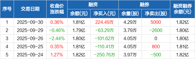 融资方面,当日融资买入1281.07万元,融资偿还1056.58万元,融资净买入224.49万元。融券方面,融券卖出5000股,融券偿还0股,融券余量4.29万股,融券余额83.83万元。融资融券余额合计1.82亿元。