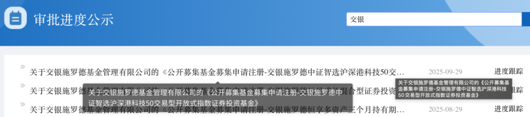 证监会网站信息显示,9月29日,交银施罗德基金上报了一只名为“交银施罗德中证智选沪深港科技50ETF”的基金,目前处于接收材料的状态。