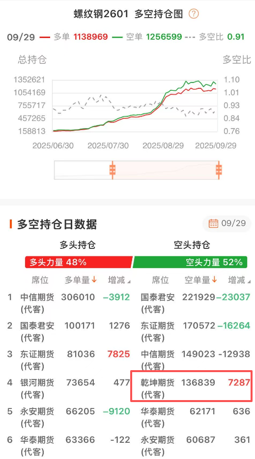 其中,乾坤期货在国内黑色与农产品期货中的持仓变化常常引发市场关注。截至9月29日,乾坤期货席位持有螺纹钢期货主力合约13.68万手空单,是该合约第四大空头席位;持有铁矿石期货主力合约33675手多单,是该合约第二大多头席位;持有菜粕主力合约27072手多单,是该合约第二大多头席位;持有棕榈油主力合约19584手多单,是该合约第四大多头席位。