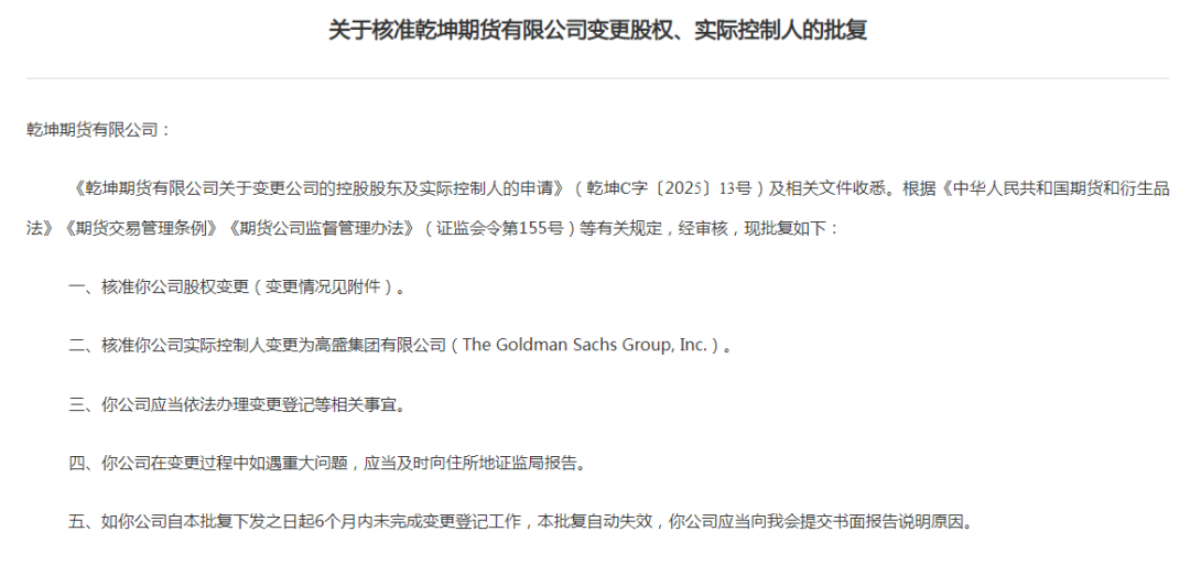 日前,中国证监会官网披露显示,乾坤期货有限公司获批变更股权和实际控制人,公司实际控制人变更为高盛集团有限公司(The Goldman Sachs Group, Inc.)。至此,我国境内已有4家外资独资期货公司。