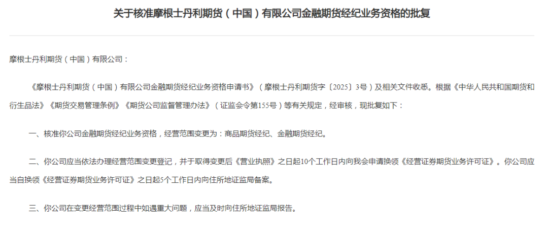 与乾坤期货股权变更获批同时披露的,还有摩根士丹利期货的金融期货经纪业务批文。中国证监会称,核准摩根士丹利期货的经营范围变更为商品期货经纪、金融期货经纪。这意味着,摩根士丹利期货的经纪业务将进一步向股指期货、国债期货等金融期货品种拓展。