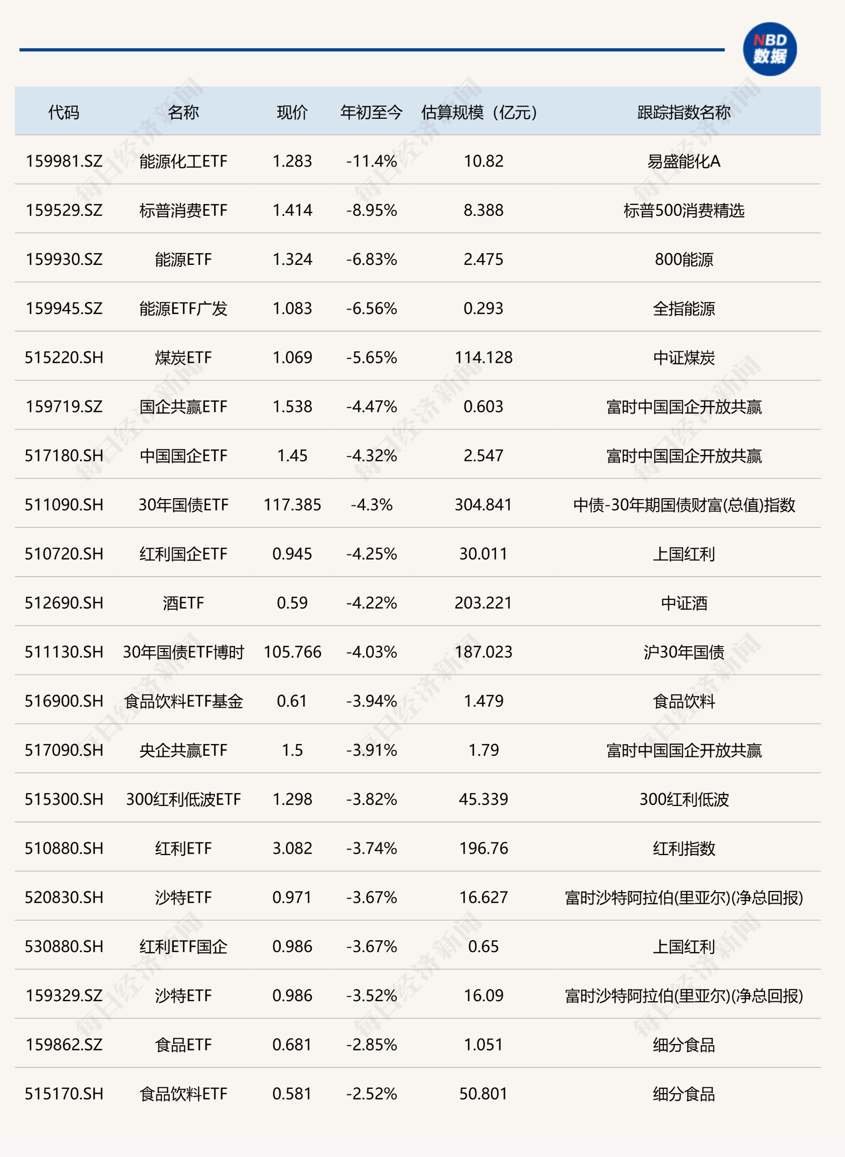 下跌方面,能源化工ETF今年来累计下跌11.4%,此外,标普消费ETF、能源ETF、能源ETF广发、煤炭ETF等跌幅均超5%。