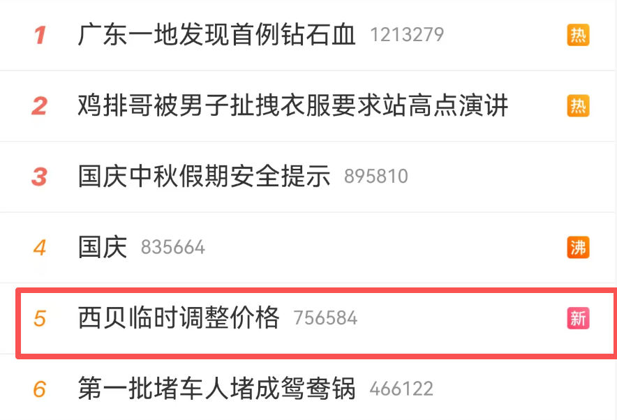 10月1日,#西贝临时调整价格#的词条飙上微博热搜榜。