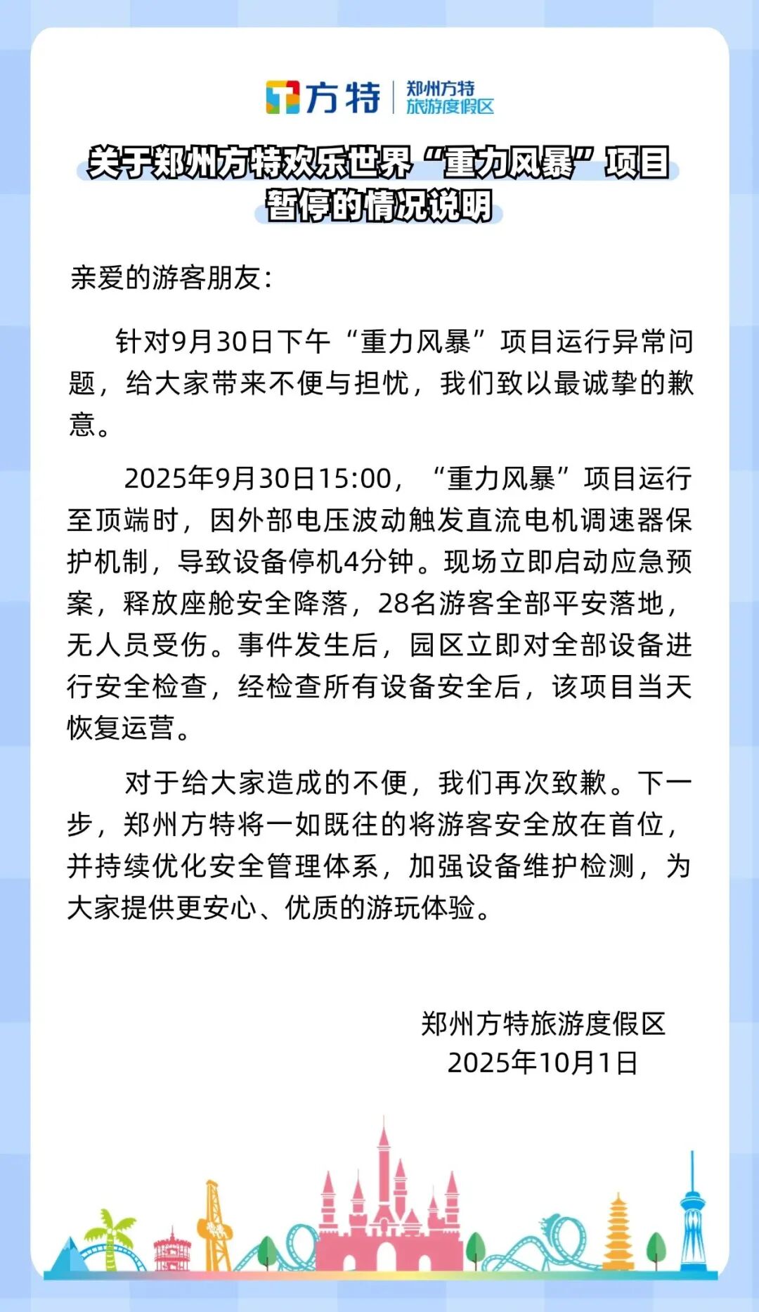 说明称,9月30日15:00,“重力风暴”项目运行至顶端时,因外部电压波动触发直流电机调速器保护机制,导致设备停机4分钟。现场立即启动应急预案,释放座舱安全降落,28名游客全部平安落地,无人员受伤。事件发生后,园区立即对全部设备进行安全检查,经检查所有设备安全后,该项目当天恢复运营。