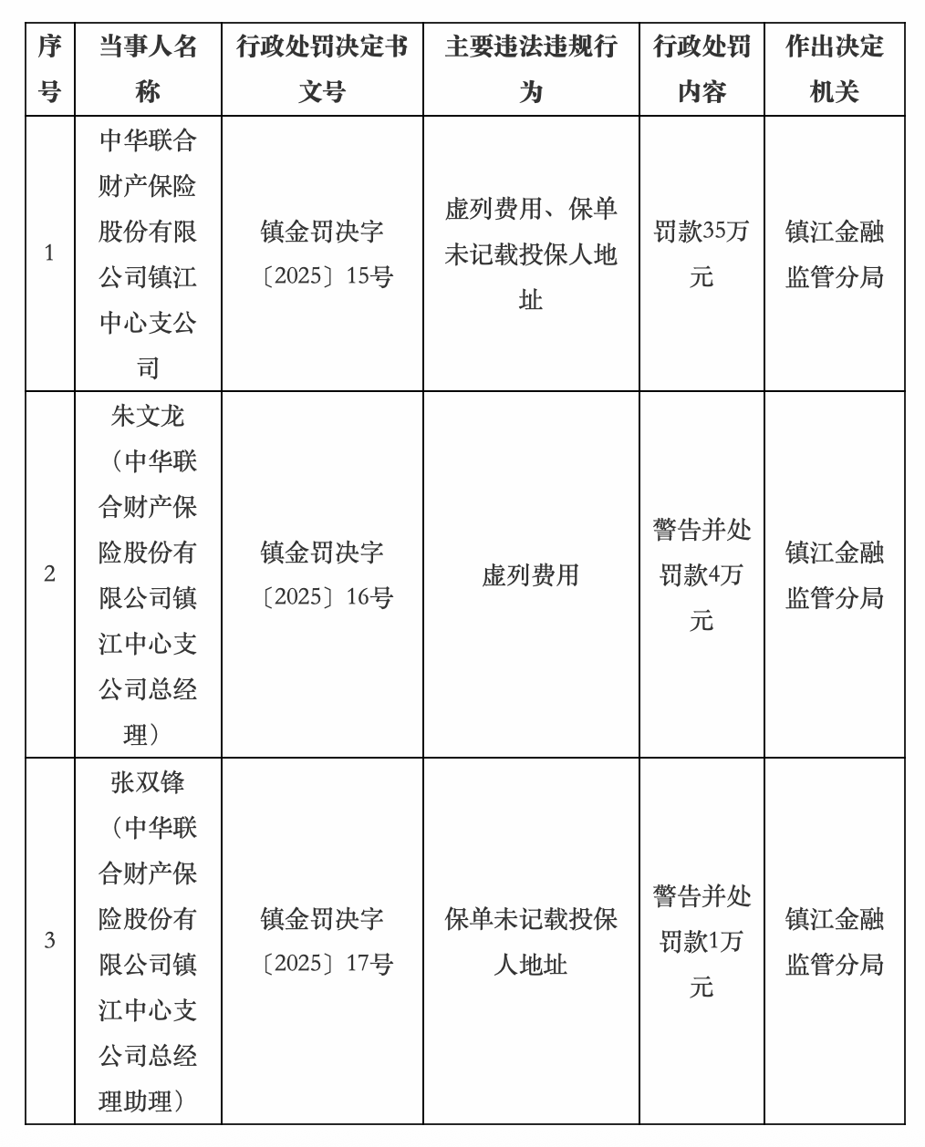 同时,朱文龙(中华联合财产保险股份有限公司镇江中心支公司总经理)因虚列费用,被警告并处罚款4万元。